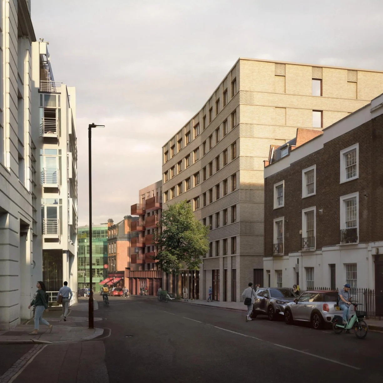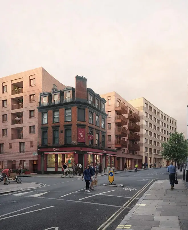 Designed with reference to Camden’s architectural character, the project, designed by Morris+Company, wraps around a historic 19th-century pub, 31 Jamestown Road, integrating seamlessly with its surroundings while introducing modern, active frontages that bring new life to the area.